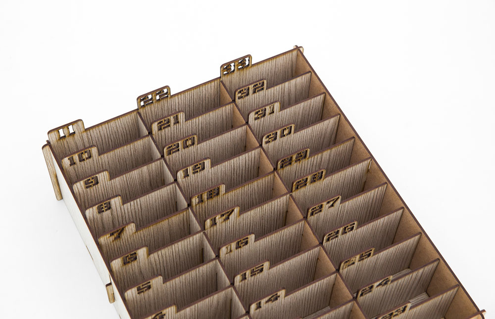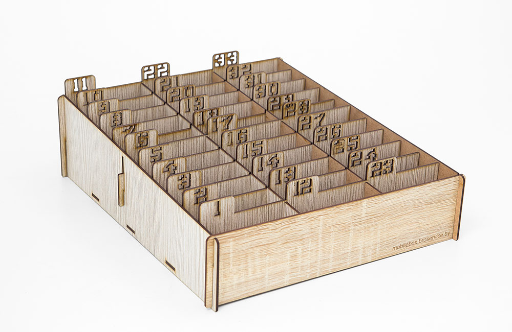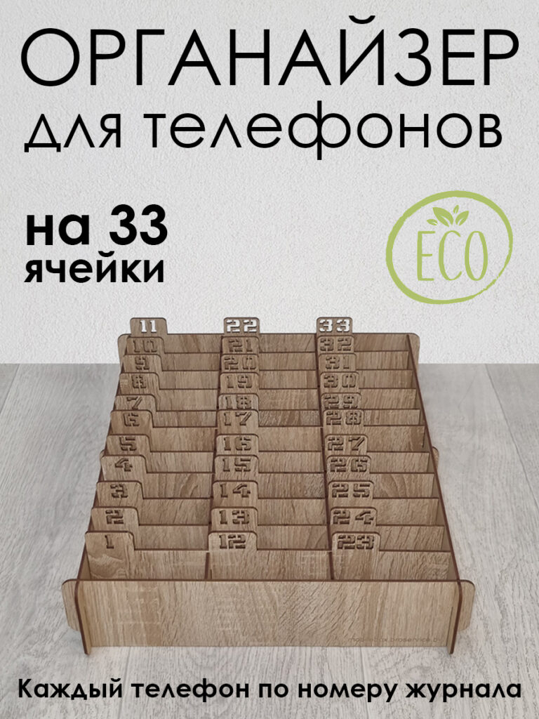 Органайзер на 33 телефона сделан из экологичных материалов. Коробка для телефонов выполнена из ЛДВП или ХДФ, это Экологический материал, имеет различные Цвета и имитации Дерева.