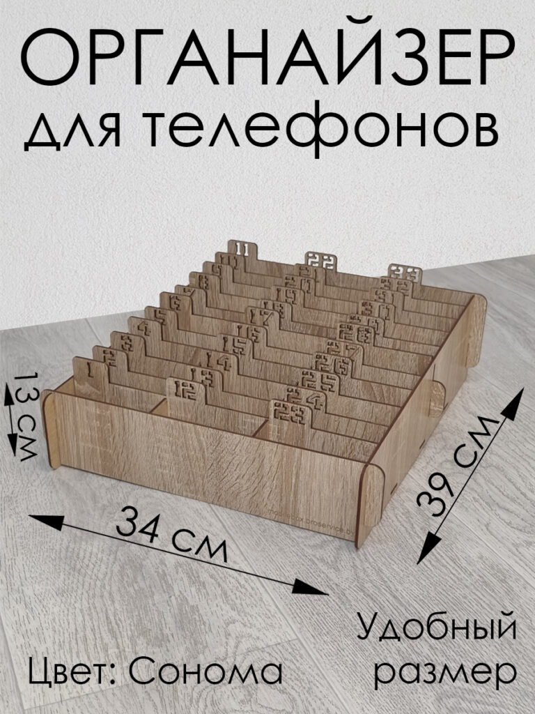 В нашем магазине представлены другие Цвета и Размеры. Модели на 33, 22 и на 15 ячеек, Меньшее количество ячеек = меньше цена, а чтобы подставка для телефонов эстетично вписалась в ваш интерьер можно выбрать подходящий цвет. В каталоге вы сможете увидите другие Ящики для телефонов на 15/22 телефонов.